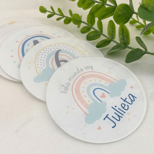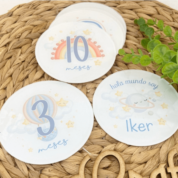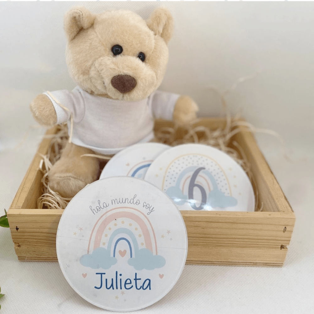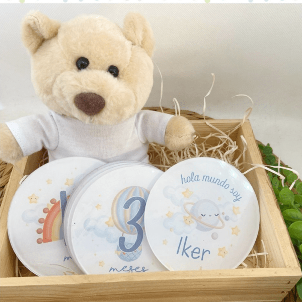 Cada pack de placas metacrilato transparente contiene: 12 placas cumple meses y una placa extra con su nombre. Bolsita para guardarlo y osito de peluche.